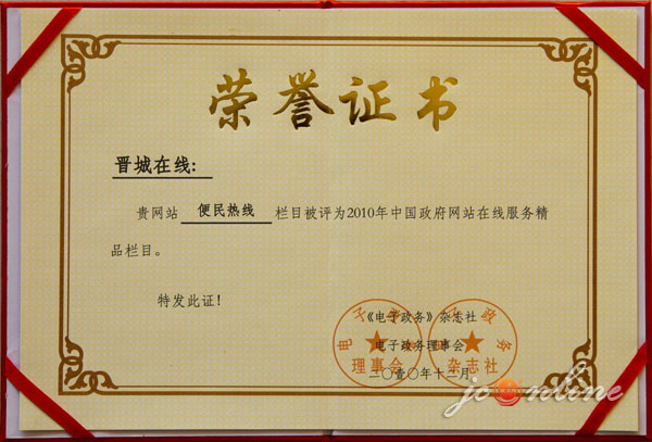 近日,在我省太原召開的2010年政府網(wǎng)站在線服務(wù)、政民精品欄目建設(shè)經(jīng)驗交流大會上,經(jīng)在線測試、專家評議、網(wǎng)民評估,我市政府門戶網(wǎng)站“晉城在線”的“便民熱線”欄目被評為在線服務(wù)精品欄目,喜獲“2010政府網(wǎng)站在線服務(wù)精品欄目獎”。